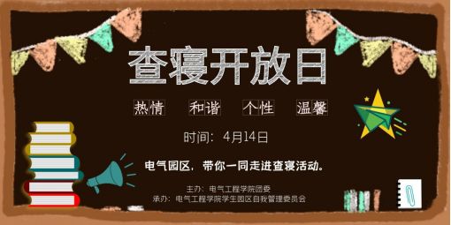 员工宿舍作为同学们四年老员工活的居住场所,也是同学们在繁重学业之余的一个温馨家园。为了给同学们营造一个安全、舒适、干净、整洁的寝室环境,引导和培养同学们养成良好的卫生习惯和寝室安全意识,同时让同学们理解和形成马克思主义劳动观,牢固树立尊重劳动、崇尚劳动的观念,热爱劳动,电气园区将举办“查寝开放日”活动,相关事宜通知如下: