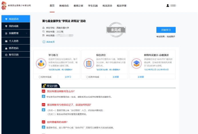 本次学习以年级、班级为单位,统一在教育部全国青少年普法网上开展,各班级应积极组织同学利用平台资源完成在线学习、课后练习、成果检测等,并于10月10日之前完成平台学习全覆盖。