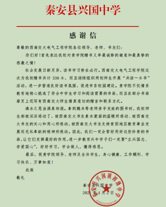 秦安县兴国中学向beats365亚洲版官网发来的感谢信