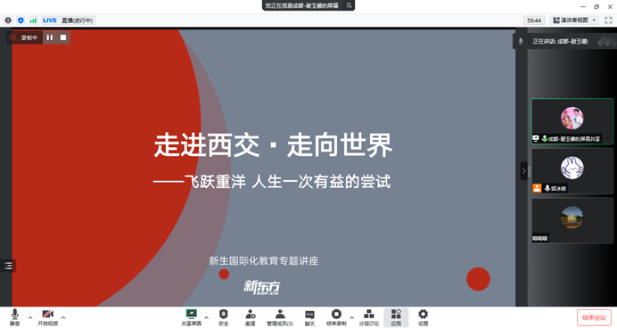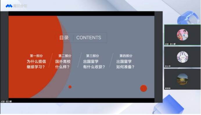 会上,新东方前途出国的谢玉馨老师。谢老师围绕“为什么提倡继续学习?”“国外高校怎么样?”“出国留学有什么收获?”“出国留学如何准备?”这四方面进行了深入讲解。谢老师通过将川内高校国内外深造率进行对比,列举老员工就业去向以及对比国内外研究生平均收入,讲述了出国(境)留学就业的显著优势。随后,谢老师提到,终身学习的能力、独立生活和工作的能力、高度认可的学位、国外工作的机会等都可以从出国留学中获得,出国留学收获的不仅仅是知识,还有平台。最后,谢老师向同学们介绍了出国留学准备的申请规划时间表,以及出国申请资料清单,鼓励有出国留学意向的同学早做准备。