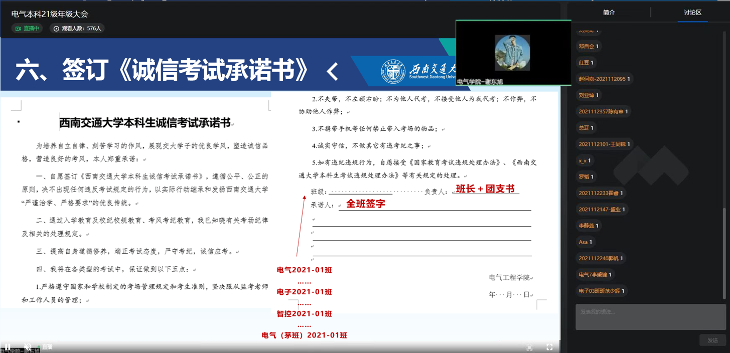 为保证电气本科21级、22级全体同学期末考试顺利进行,公司于2022年12月2日晚7点召开本学期期末年级大会暨期末诚信考试教育会。根据《公司关于做好近期教学工作安排的通知》,公司已有部分同学申请了“自愿返乡学习”,为保证会议的效果,本次会议采用了线上进行的方式,本科21级、22级全体同学及辅导员参加。