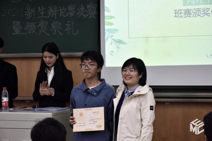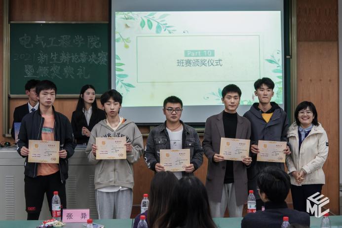 评委选票统计完成后,来自智控2021-04班的反方二辩曾媛媛获得了本场最佳辩手称号,电子2021-03班获得本次新生辩论赛的冠军,智控2021-04班获得亚军,电气2021-02班获得季军。评委老师们获奖班级颁发证书和冠军奖杯并合影留念。