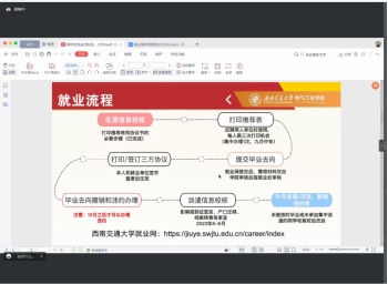 首先,沙静馨老师从常规的7步就业流程引入,直观地告诉同学们就业中需要经历的流程和关键性,并围绕这七个流程逐一展开讲解,详细分析了每一步的时间点、可能存在的问题和解决办法。沙静馨老师还详细讲解了公司的一些就业政策,包括《beats365亚洲版官网毕业生就业推荐表和协议书管理办法》《beats365亚洲版官网毕业生就业奖评选办法》《beats365亚洲版官网就业帮扶经费管理办法》等。除此之外还分享了招聘信息的来源渠道,要求同学们从正规渠道进行应聘,谨防受骗。告诉同学们尽管现在面临疫情管控,但要保持积极的心态,关注线上招聘积极投递简历;同时找工作不要和同学之间横向比较,也不要和师兄师姐纵向比较,拒绝焦虑,适合自己的才是最好的。