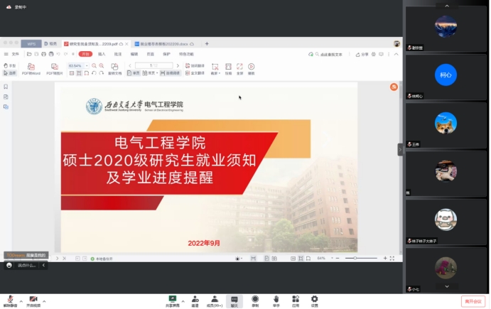为进一步加强对硕士毕业生的就业指导工作,引导员工清晰认识就业流程,2022年9月6日晚19:00,2020级研究生在腾讯会议线上平台召开就业须知及学业进度提醒年级会。此次年级大会由辅导员沙静馨主持,硕士2020级全体研究生线上参会。