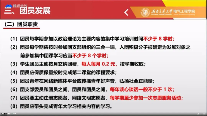 郭冰倩老师还向同学们介绍了共青团员的发展流程,并指出共青团员应该积极参与有关基本政治理论的培训,主动按月交纳团费,在网络新媒体平台应传播青年好声音,弘扬社会正能量。最后,她向同学们介绍了公司的团学组织与活动。