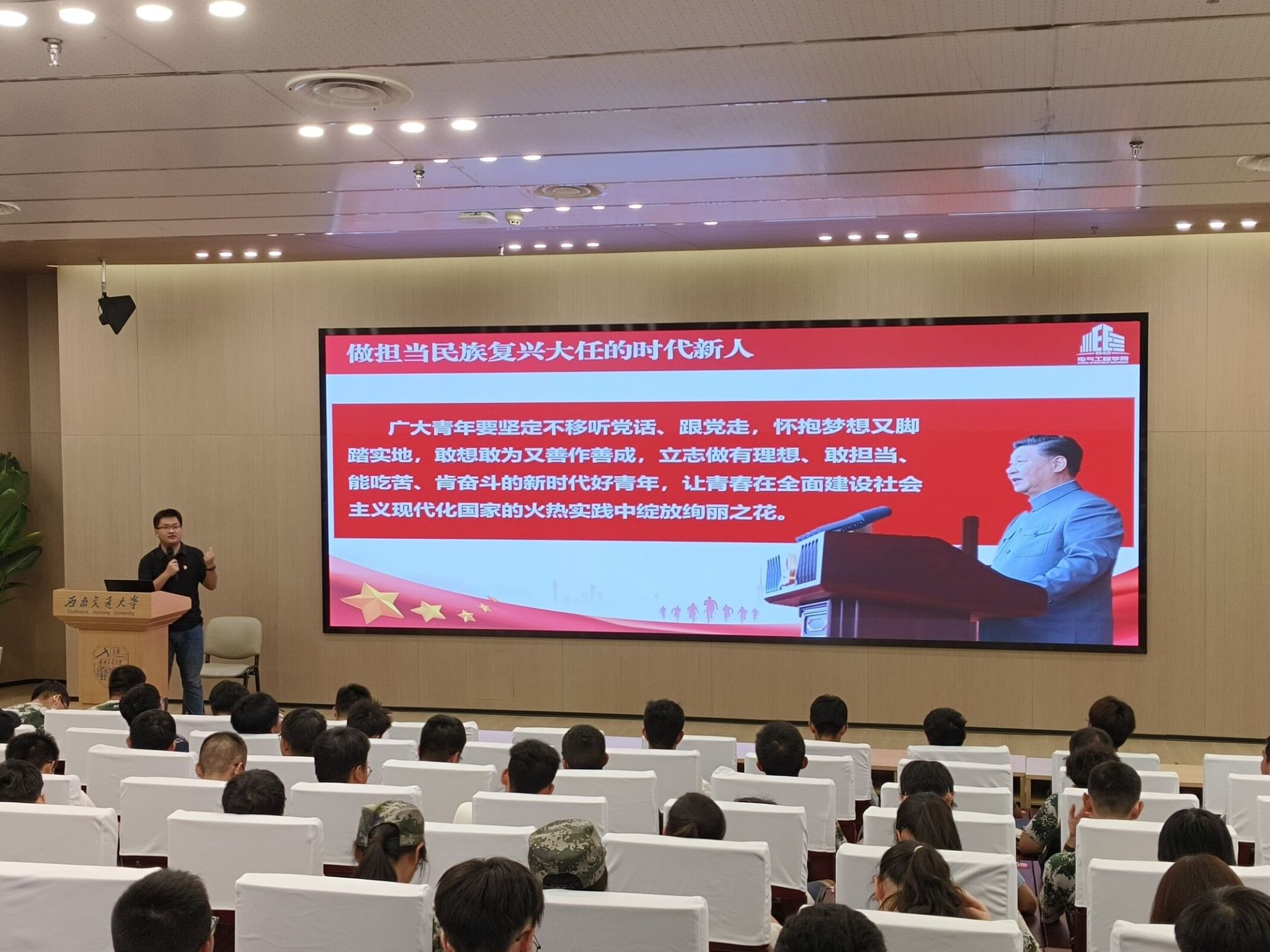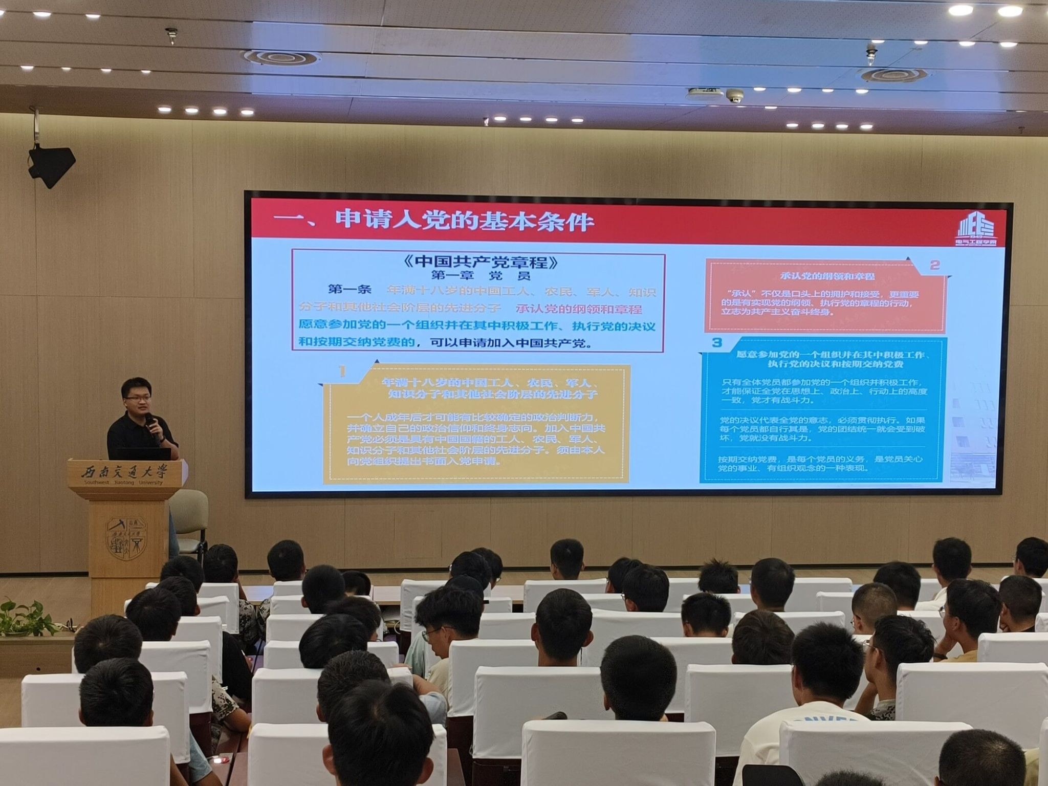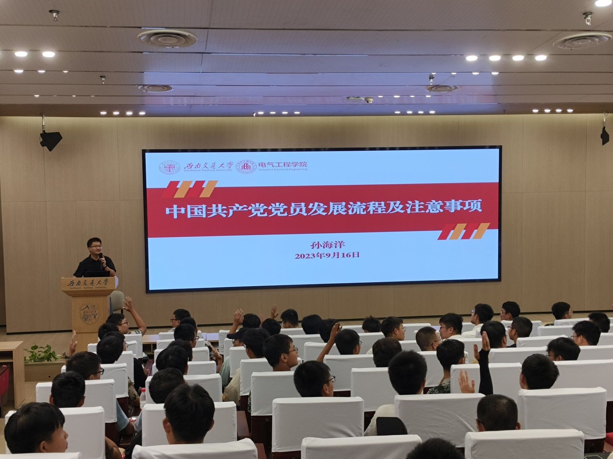 为深入学习贯彻习近平新时代中国特色社会主义思想,落实党的二十大重要精神,2023年9月16日晚上20:00,beats365亚洲版官网本科2023级在beats365亚洲版官网犀浦校区一号报告厅开展党员发展专题教育讲座。此次讲座由辅导员孙海洋老师主讲,beats365亚洲版官网本科2023级辅导员詹睿、罗霁轩和全体新生参与。