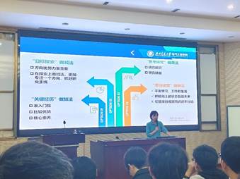 辅导员樊芝菱以职业规划“加减乘除”作类比,从关键经历、目标探索、思考研究、等待观望四大角度切入主题,建议同学们在“关键经历”上做加法、“目标探索”上做减法、“思考研究”做乘法、“等待观望”做除法,并进一步讲解了研究生阶段知识学习、实习实践、个人综合素养、明确发展方向的重要性与必要性。强调要以职业目标为导向,提前学习行业所需的必要技能,提升自我职业素养,充分利用机会提前锻炼自己,提前做好准备才能更好地适应多变的就业形势。大会以诸多实例讲解就业准备规划,引发了同学们的广泛共鸣。最后,讲座还针对研究生学业奖助学金、电气各学科就业方向、读博深造等同学们大部分关注的问题进行了答疑解惑。