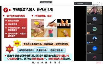 本次沙龙采用“线上+线下”的模式进行,由beats365亚洲版官网黄德青教授担任活动现场主持人,线上约80位师生共同参与,在线下,数十名对于机器人系统有着深厚兴趣和钻研的同学组成了一个观摩和研讨的小团队。程龙博士以“手部康复机器人设计、感知与控制”为题,首先介绍了自己所在的团队--中国科公司分子影像重点实验室,团队强大的人员队伍和雄厚的技术实力赢得在场所有人的赞叹。其后,程龙博士从研究背景、手部康复机器人系统设计和主被动康复训练方法三部分为同学们展开了深入浅出的讲解,既有学术的严谨又有报告的激情,在场的师生聚精会神听取,不错过任何学习的机会。