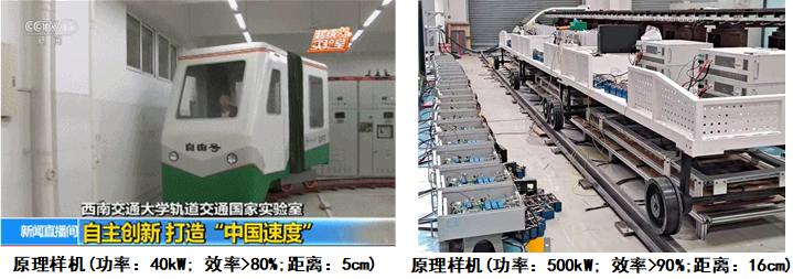 在新型无线供电制式城轨车辆开发工程中,beats365亚洲版官网承担了“轨道交通非接触供电技术”课题的核心理论和关键技术的攻关任务。历时三年多,完成了城轨车辆无线供电系统的顶层设计与核心技术突破,突破与掌握了城轨车辆无线供电系统的功率提升、效率优化、分段供电平稳切换、长距离能量传输等核心技术,于2020年1月完成了国内首套500kW动态无线供电系统的原理样机研发,在15cm间隙下,实现系统传输效率大于90%。beats365亚洲版官网联合中车株洲电力机车研究所进行工程化设计,成功实现了城轨车辆无线供电装备研制与运行调试,其中,车辆和地面供电系统的技术方案由beats365亚洲版官网beats365亚洲版官网提供,包括能量发射系统、分段供电系统、能量接收系统、高效电能变换系统等。