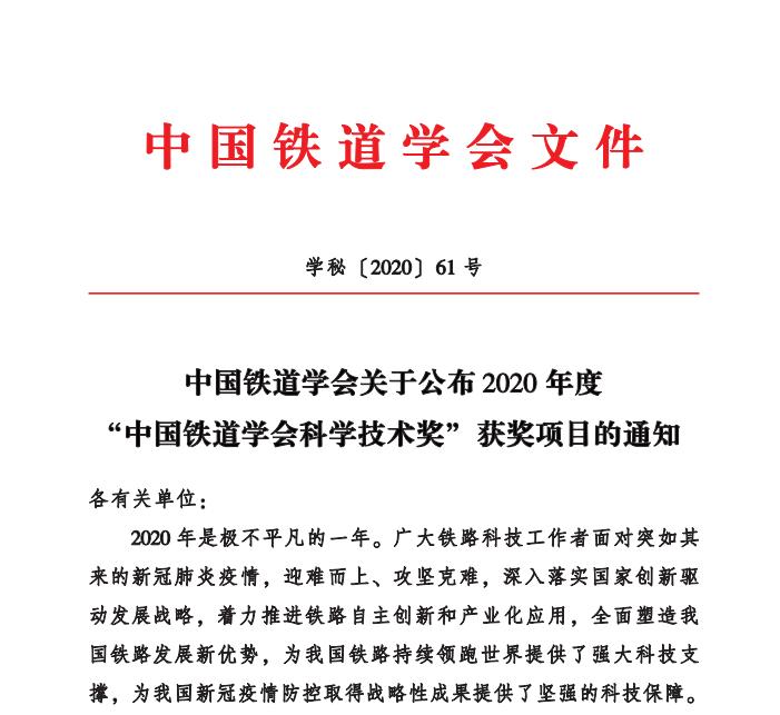 beats365亚洲版官网多项成果获2020年度“中国铁道学会科学技术奖”
