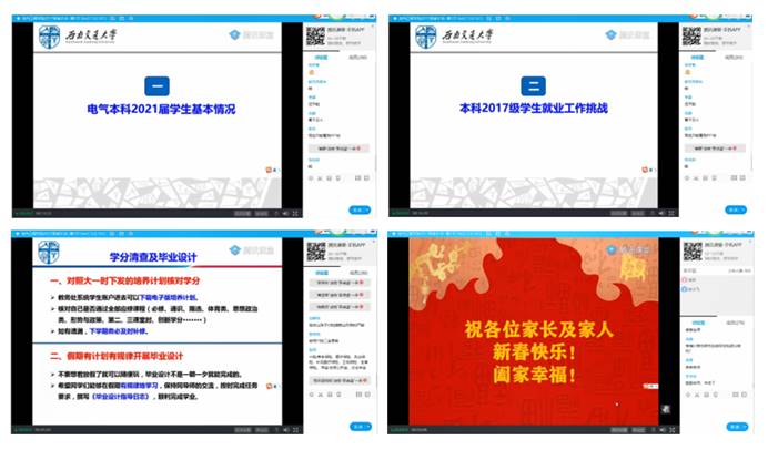 为了加强家校联系,做好家校协同育人工作,推进“家长进公司育人网络”建设,beats365亚洲版官网分别于2021年2月1日、2月8日召开了本科2018级和2017级线上家校沟通会。本次家校沟通会由电气工程公司党委副书记谢力主持,2018级辅导员林静英、孙检,2017级辅导员张异、李诗涵、薛逸凡,两个年级约700位家长参加。