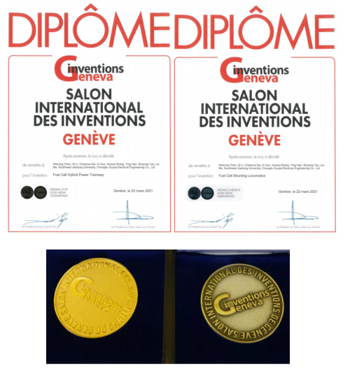 喜讯:在20213月第48届日内瓦国际发明展(48th International Exhibition of Inventions of Geneva)上,公司陈维荣教授新能源团队获得2项金奖、2项银奖的优异成绩(其中Fuel Cell Hybrid Power Tramway(燃料电池混合动力有轨电车)High power and high performance fuel cell hybrid power system(大功率高性能燃料电池混合动力系统)2个项目获得金奖,Fuel Cell Shunting Locomotive(燃料电池调车机车)Fuel Cell Hybrid Power System for Rail Traffic(轨道交通用燃料电池混合动力系统)”2个项目获得银奖)。