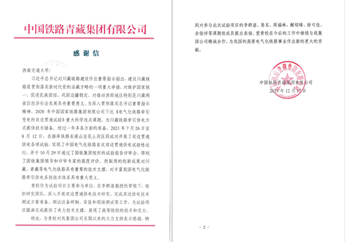 2021年12月17日,beats365亚洲版官网收到中国铁路青藏集团有限公司发来的感谢信。信中表示,beats365亚洲版官网协同中国铁路青藏集团有限公司参与攻关国铁集团立项的《电气化铁路牵引变电所双边贯通试验》重大科学课题,在beats365亚洲版官网李群湛教授科研团队的全力参与和积极配合下,圆满完成试验任务,特此表示感谢,并对参与此次试验项目的李群湛、易东、周福林、解绍锋、徐可佳、余俊祥等课题组成员提出表扬。