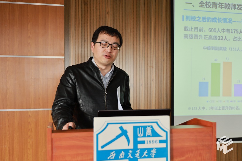 接着,胡海涛对青年教师的工作情况进行了具体分析。首先,他概括了全校青年教师的发展状况,分别从形势政策、基本情况、科研情况、职称分布、晋升情况以及人才情况进行分析。随后,他提到人才发展规律,指出关心年轻人是人才发展强校战略的重要举措,只有更多地关注青年教师,他们才能更有干劲,更能担当中国铁路建设的重任,更能挑起公司发展的大梁。之后,他总结了青年教师发展面临的困境:未融入团队、研究方向不契合、无青年基金、无实验设备场地等困难。对此,他提出了公司的举措与建议:公司人才工作组要给予青年全方位的服务,发布团队、人才招聘信息,接受海内外优秀教师、博士/博士后求职简历,加强海外优青、海外青年博士的联系引进工作,切实保障新进青年、专职博士后的交流和帮扶工作,同时确保引进人才的科研、招生、办公场地等事宜。最后他希望通过公司的支持帮助,青年教师能够激发内在动力,未来能够更好地发展。