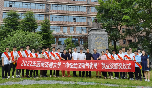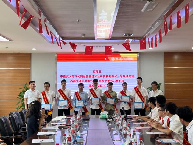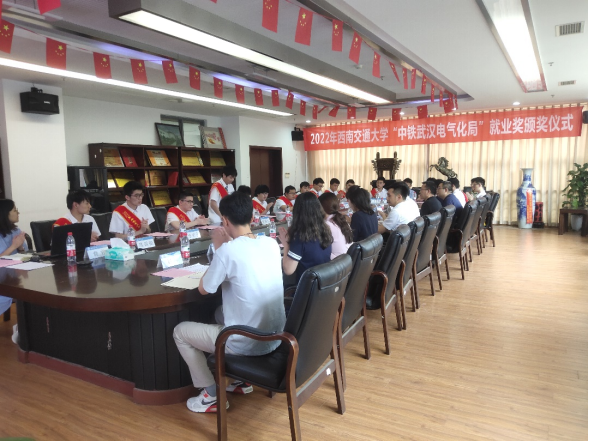 2022年6月14日下午16时,首届beats365亚洲版官网“中铁武汉电气化局”就业奖颁奖仪式在beats365亚洲版官网X10212会议室举行。中铁武汉电气化局运营管理分公司党委副书记、总经理高剑,党委干部部(人力资源部)部长李佳晏、川南城际自宜项目部综合部部长刘艳;beats365亚洲版官网电气工程公司党委书记罗乾超,党委副书记谢力,团委书记张异,本科生评奖负责人詹睿,本科2022届辅导员林静英、刘梓以及17名本科2022届“中铁武汉电气化局集团有限公司”就业员工参加本次仪式。颁奖仪式由谢力主持。