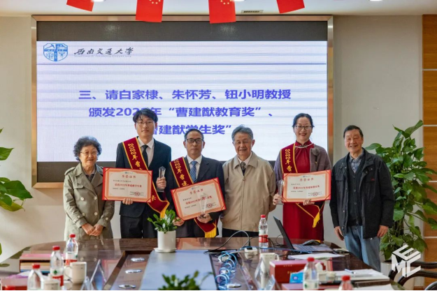 随后举行2022年“曹建猷教育奖”“曹建猷员工奖”的颁奖仪式。白家棣教授、朱怀芳教授、钮小明教授分别为“曹建猷教育奖”获奖代表赵丽平老师、蒋朝根老师,“曹建猷员工奖”获奖代表万志强同学颁奖并合影留念。获奖老师代表发表感想:感谢理事会能将这份荣誉授予自己,这将继续激励他们在曹院士勇于担当、开拓创新的精神指导下为铁路电气化和自动化事业努力奋斗,再创辉煌。获奖员工代表对曹建猷科技教育基金委员会表达了感谢,他将秉持一颗为国为校奉献自我的赤诚之心,继续奋斗在轨道交通行业中,为中华民族伟大复兴奉献自己的一份力量。