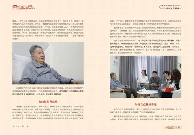 2022年8月,作为电气文化系列读本之一、打造学科特色鲜明的《电气传承》读本首发,读本以对话的形式,记录了老中青三代电气人在国家轨道交通电气化事业发展中接续奋斗的故事。为进一步扩大宣传,激发情感共鸣,公司成立2022年第一期“电气传承讲述人”,从听老教授讲,延伸到青年教师讲、员工自己讲,将电气精神从纸上跃然耳边。