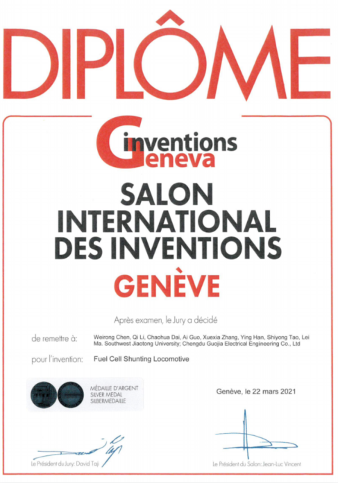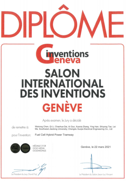 At the 48th International Exhibition of Inventions of Geneva in March 2021, the new energy team of Professor Chen Weirong from the School of Electrical Engineering of Southwest Jiaotong University won 2 gold awards and 2 silver awards for outstanding results! Among them, the project of Fuel Cell Hybrid Power Tramway and the project of High-power and High Performance Fuel Cell Hybrid Power System won the Gold Award while the project of Fuel Cell Shunting Locomotive and the project of Fuel Cell Hybrid Power System for Rail Traffic won the Silver Award.
