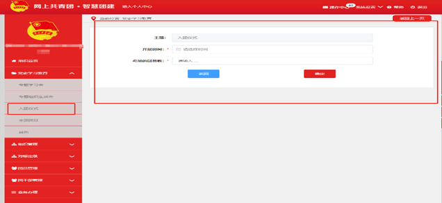 智慧团建录入:完成老团员重温入团誓词活动后,需将活动开展情况录入到“智慧团建——党史学习教育——入团仪式”板块。