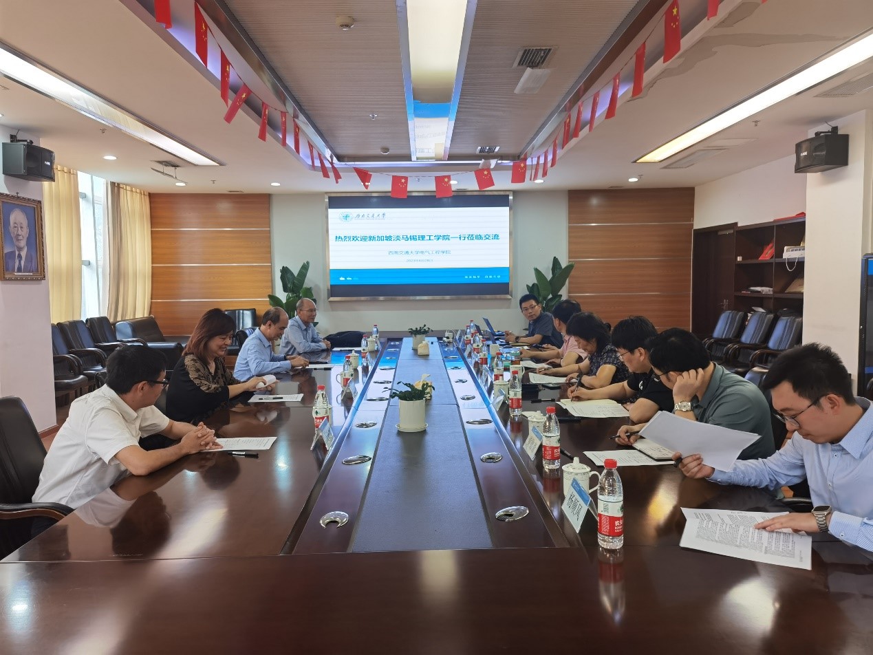On June 28th, the delegation from Temasek Polytechnic in Singapore visited the college for exchange. Mr. Song Guoyun, Dean of the School of Engineering of Temasek Polytechnic, Mr. Chen Shuli, Senior Advisor of the President's Office (former Vice President), Mr. Han Ming, Chief Scientist, and Mr. Wang Gucheng, Director of the Clean Energy Research Centre; Prof. He Zhengyou, Dean of the School of Electrical Engineering of Southwest Jiaotong University, Prof. Feng Xiaoyun, Prof. Chen Weirong, Vice Dean Chen Minwu, and Vice Dean Liu Zhigang, Prof. Huang Deqing, participated in the meeting. Vice Dean Chen Minwu presided over the meeting.