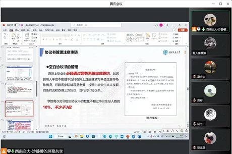 首先,沙静馨老师通报了年级现在就业情况,提醒各位同学积极投递简历,尽管现在因特殊原因有耽误,但整体的就业进度是在向前推进,要主动出击,不要坐以待毙。接着,沙静馨老师围绕在在线签约和线下签约两种情况给同学们做了详细的介绍,并针对员工实际情况,详细说明了空白协议书的管理和使用要求。