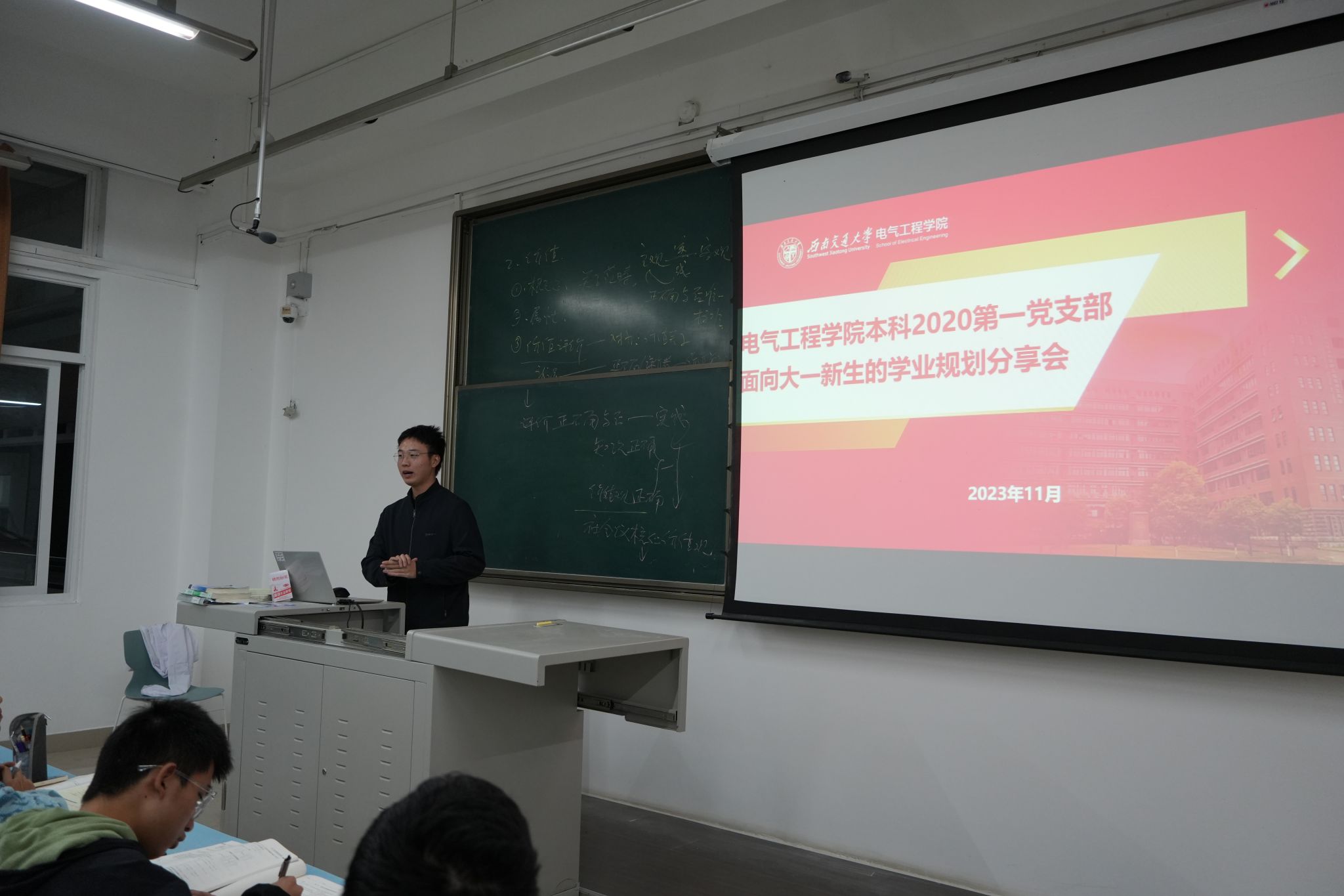 2023年11月28日,电气本科2020第一党支部开展了面向大一新生的学业规划分享会。党支部书记艾效天同志主持分享会,党支部预备党员、2023年”竢实扬华“奖章获得者谈思睿同志从学业,科研,员工工作等多方面分享了自己的经验。