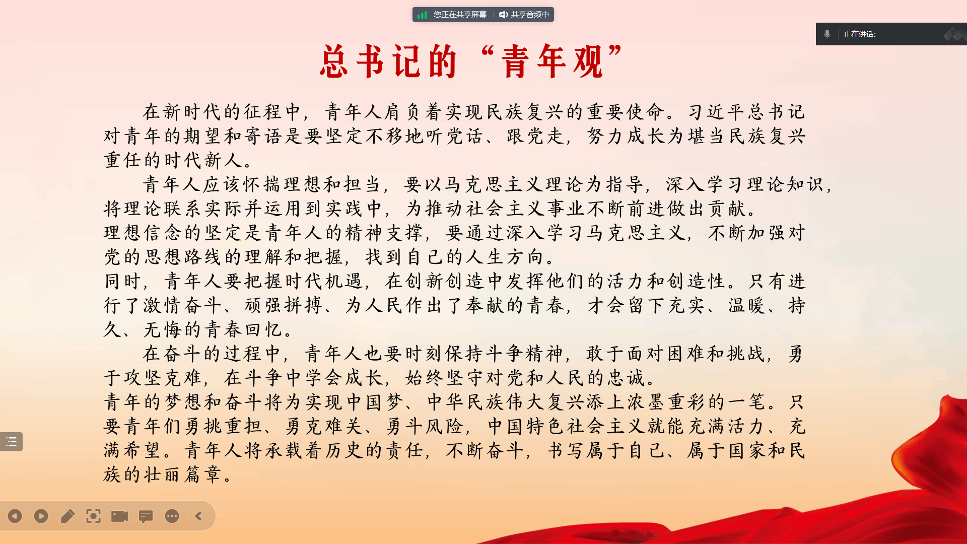 活动第二环节为青年大讨论。首先,由支部书记聂广博同志领学习近平总书记的青年观相关内容。“立足新时代新征程,中国青年的奋斗目标和前行方向归结到一点,就是坚定不移听党话、跟党走,努力成长为堪当民族复兴重任的时代新人。”这是习近平总书记对亿万青年的寄语,也是青年人肩负的时代使命。党和国家的希望寄托在青年身上,有责任有担当,青春才会闪光。