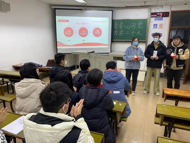 为了检验同学们的学习成果,学习小组于129日晚在九里校区开展了“青春心向党 共学二十大”主题知识竞赛活动。竞赛题目由党的二十大报告、党章等内容组成,目的在于引导班级同学原原本本,逐字逐句学习党的二十大报告和党章,学习习近平总书记在党的二十届一中全会上的重要讲话精神,推动党的二十大精神在同学们心中落地生根,开花结果。此次竞赛采用线上PK和线下抢答相结合的方式,按照积分排名高低决出一等奖一名、二等奖两名,并对于获奖同学予以了礼品奖励。