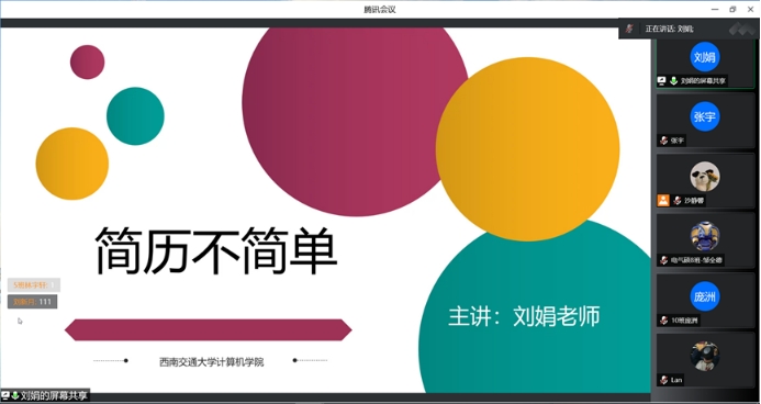 刘娟老师以“简历不简单”为主题,围绕自己的简历、简历准备、简历制作、简历诊断四个部分为同学们讲解如何制作一份优秀的简历,做出最响亮的“敲门砖”。