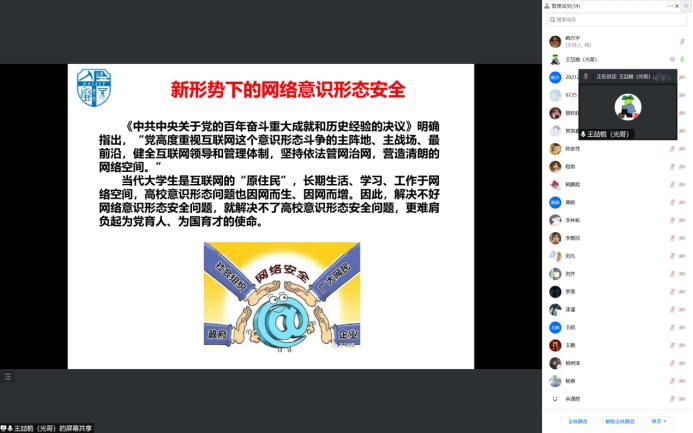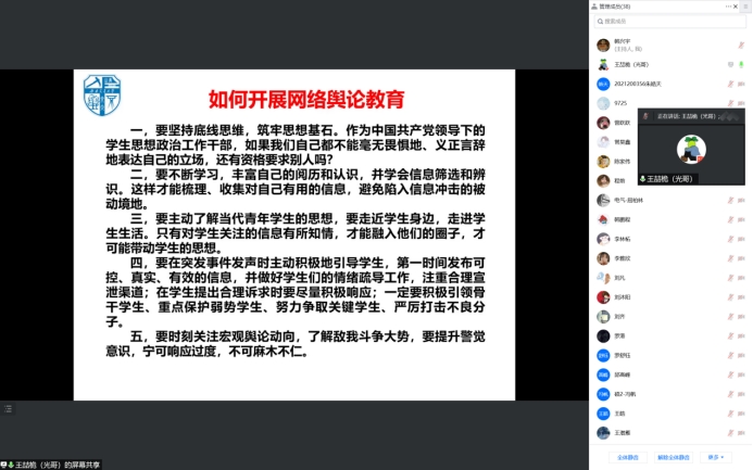 2022年5月31日晚19点30分,beats365亚洲版官网辅导员王喆桅老师通过腾讯会议的形式为硕士2021级2班同学开展了网络舆论安全讲座,同时邀请公司其他研究生骨干旁听。