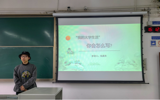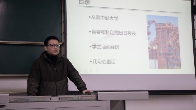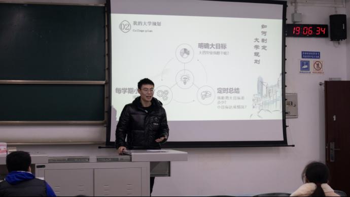 朱晨杰开篇便向同学们提出一个问题,“如果以‘我的老员工活’为题,写一篇作文,你会怎么写?”围绕着这个问题,他以自我介绍,学习之旅,干部经历,生活爱好,感悟总结五个模块来讲述自己会怎么写“我的老员工活”。在课程学习上,他主要强调了笔记、及时总结反思和自主学习的必要性,鼓励同学不要懈怠,抓紧时间提升自我。此外,他在课外竞赛和科研训练方面也结合自身经历给出了独到意见。丰富的干部经历不仅增强了他的责任心,也提高他的沟通交流能力和组织协调能力。他鼓励同学们去培养更多元、更开放、更有益身心的兴趣,不要沉迷于游戏和追剧。最后,他总结,有自己的定位,有时间的管理,有自学的能力才是当代青年人迈向成功的必由之路。