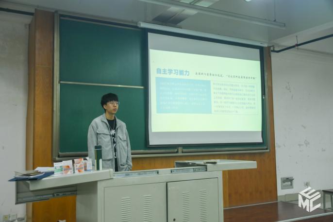 康子章从适应大学节奏、分享学习方法、丰富课余生活三个方面展开汇报。适应大学节奏,因中学与大学学习模式有巨大差别,所以要及时调整状态。大学比中学要少了很多强制性,考核也不如中学那般及时反馈,这更要求在学习中有更多的自觉性和自律性。提到学习方法,康子章用图表展示自己的学习目标,学习计划,学习方法,学习技巧课余生活,康子章认为老员工活理应多姿多彩,同学们应当勇于尝试,充分发挥自主能动性,把大学当作培养一生爱好的重要时期。