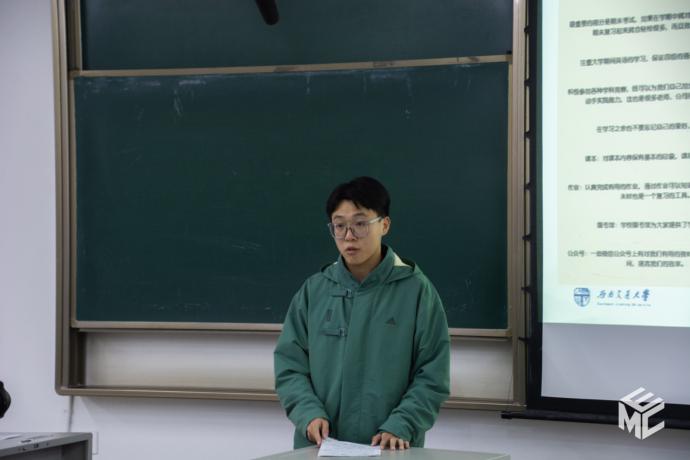 林雨眠首先向同学们展示了自己在三年来所取得的一些成绩。在这之后,他向同学们分享了自身的经验,包括明确自己的目标,做到上课认真听讲作业独立完成期末考前冲刺等。同时,他也向同学们分享了竞赛方面的经验。他建议,同学们应该从简单的比赛入手,多与指导老师沟通,找到靠谱的队友,利用网络资源自学相关知识,同时做好占用大量课余时间的心理准备。在最后,他向同学们分享了有关科创的经验。他表示,同学们应该尽可能早的参与到科创项目中去,多读论文,写学习报告,练习写作论文,和老师、学长学姐沟通,早日积累科创经验