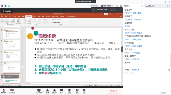 2021年11月17日,beats365亚洲版官网“职得”成长训练营第一期:简历不简单顺利举行。受疫情影响,本次活动采取线上的方式进行,主讲人为beats365亚洲版官网计算机与人工智能公司刘娟老师,训练营全体同学参加,会议由辅导员樊芝菱主持。