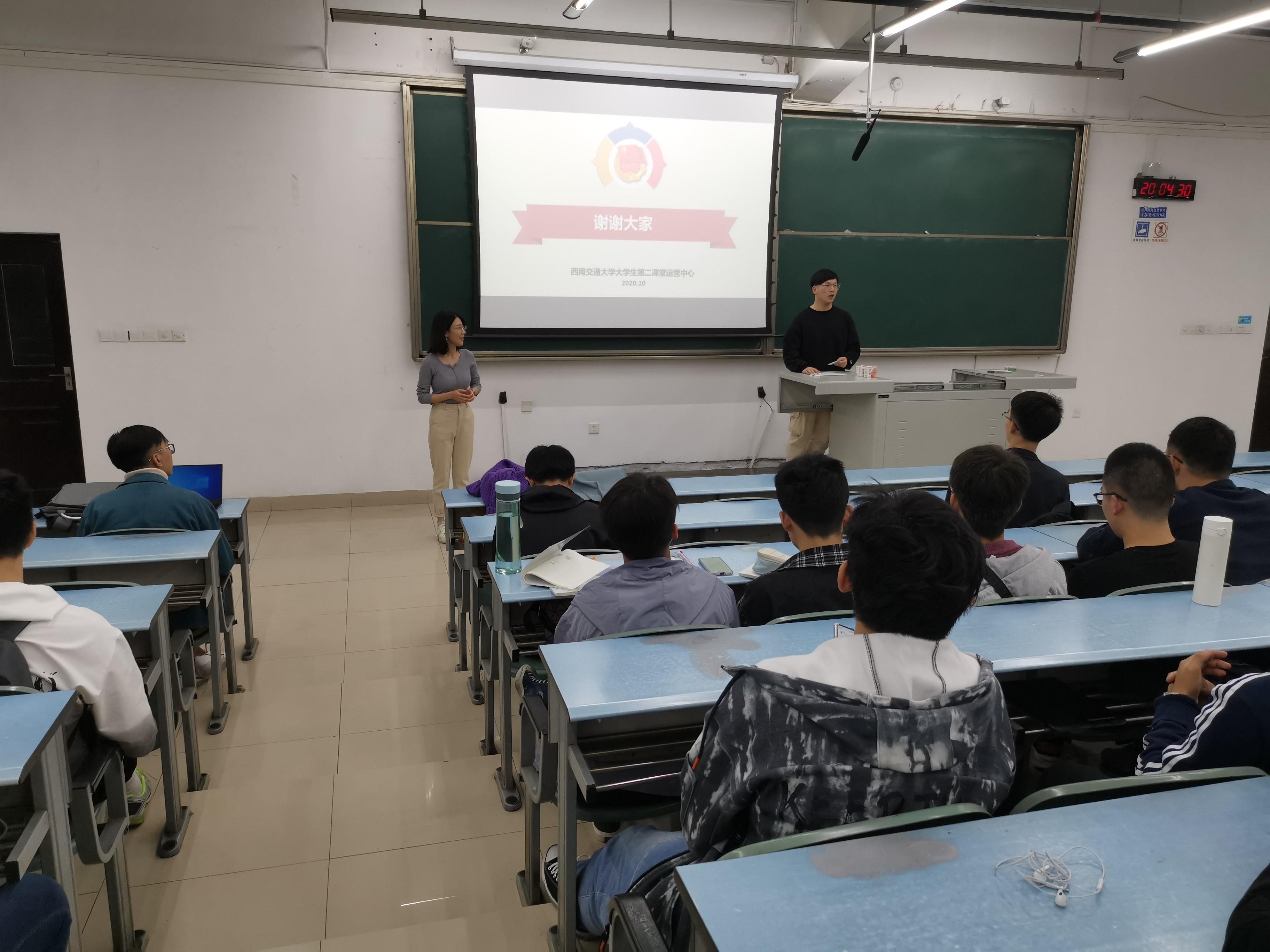 20201013日晚7时,beats365亚洲版官网在犀浦校区X2218X2321开展了“入学教育之第二课堂情况介绍讲座”,本次讲座由校团委汪宣霖老师主讲,本科2020级辅导员关怀、郭冰倩、赵娜及全体新生参加讲座。