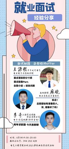 202065日晚19:00,beats365亚洲版官网本科2021届就业指导系列活动之就业面试经验线上交流会。本次会议邀请到了电力电子与控制专业的王源程、电力系统及其自动化专业的麻晓和电子信息工程专业的李奇。他们各自从事不同领域的工作,并且都到此来分享自己在求职过程中的心得体会和宝贵经验。