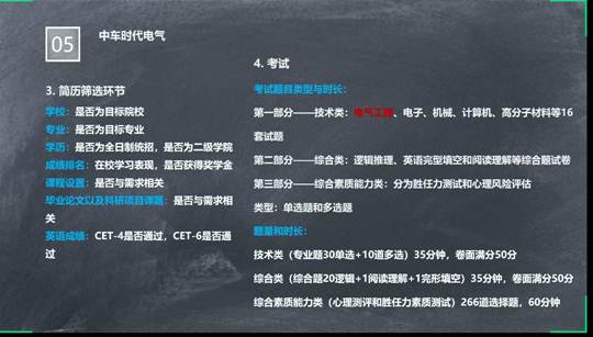 第二位进行分享的是就业于南瑞继保的麻晓,他首先简单介绍了一下一般毕业生都会经历过的就业流程并列出了许多有利于寻找工作的网站或软件,之后又根据电气工程的专业方向阐述了适合该专业的一些工作单位,接着便讲授了自己在制作简历方面的一些心得,并且告诉大家如何根据自己的简历来准备面试环节,最后介绍了自己的工作单位在招聘人员时的一些流程和考试,为同学们提供了很大的助力。
