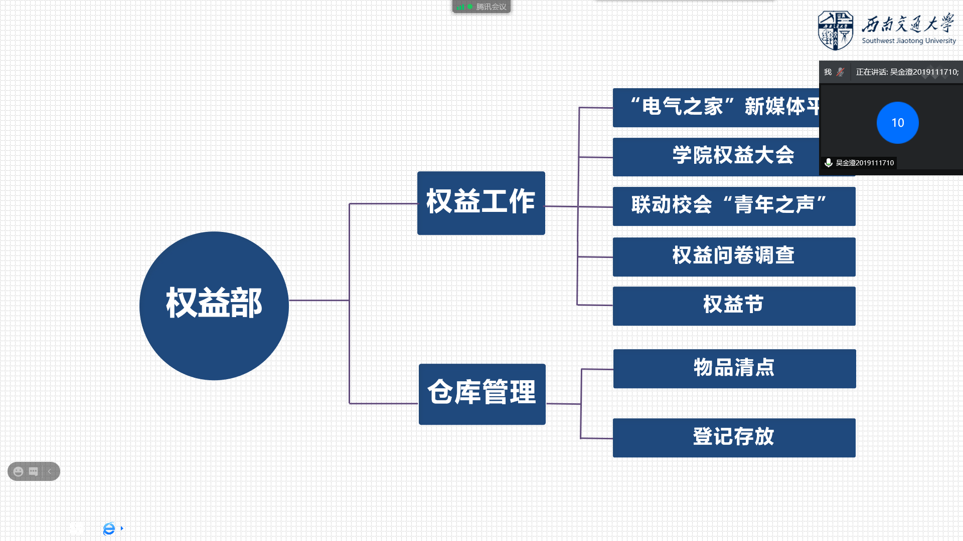 本次线上会议我们有幸邀请到员工会指导老师孙检,作为本次会议的特邀指导嘉宾,由权益部副部长赵桐浠主持,权益部全体成员参与。