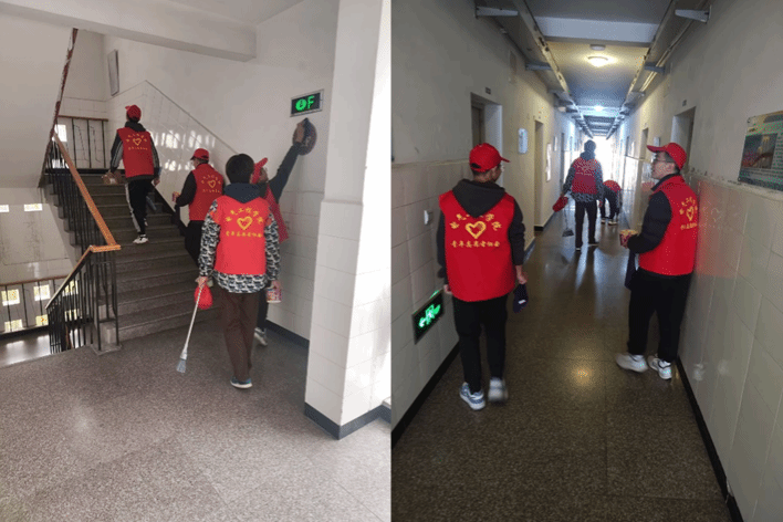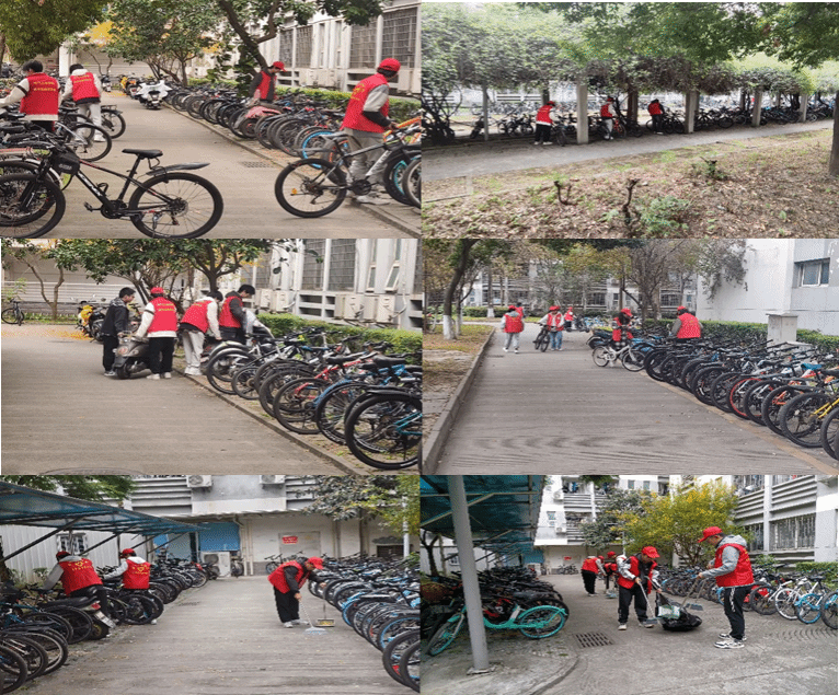 在分发完志愿马甲后,同学们便开始了本次志愿服务活动。大家井井有条、认真负责,有序开展垃圾拾捡、落叶清扫、杂草清理、自行车及电动车规范摆放、责任区墙面和公告栏等区域广告张贴清除等志愿活动。