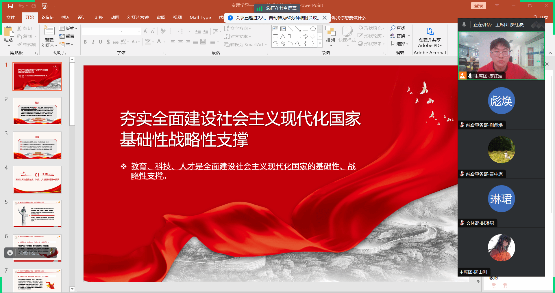 为深刻领悟教育、科技、人才是全面建设社会主义现代化国家的基础性、战略性支撑这一重要意义,2023年3月11日,beats365亚洲版官网研究生会开展“夯实全面建设社会主义现代化国家基础性战略性支撑”主题学习活动, beats365亚洲版官网研究生会全体成员参加了此次活动,活动由廖红波主讲。