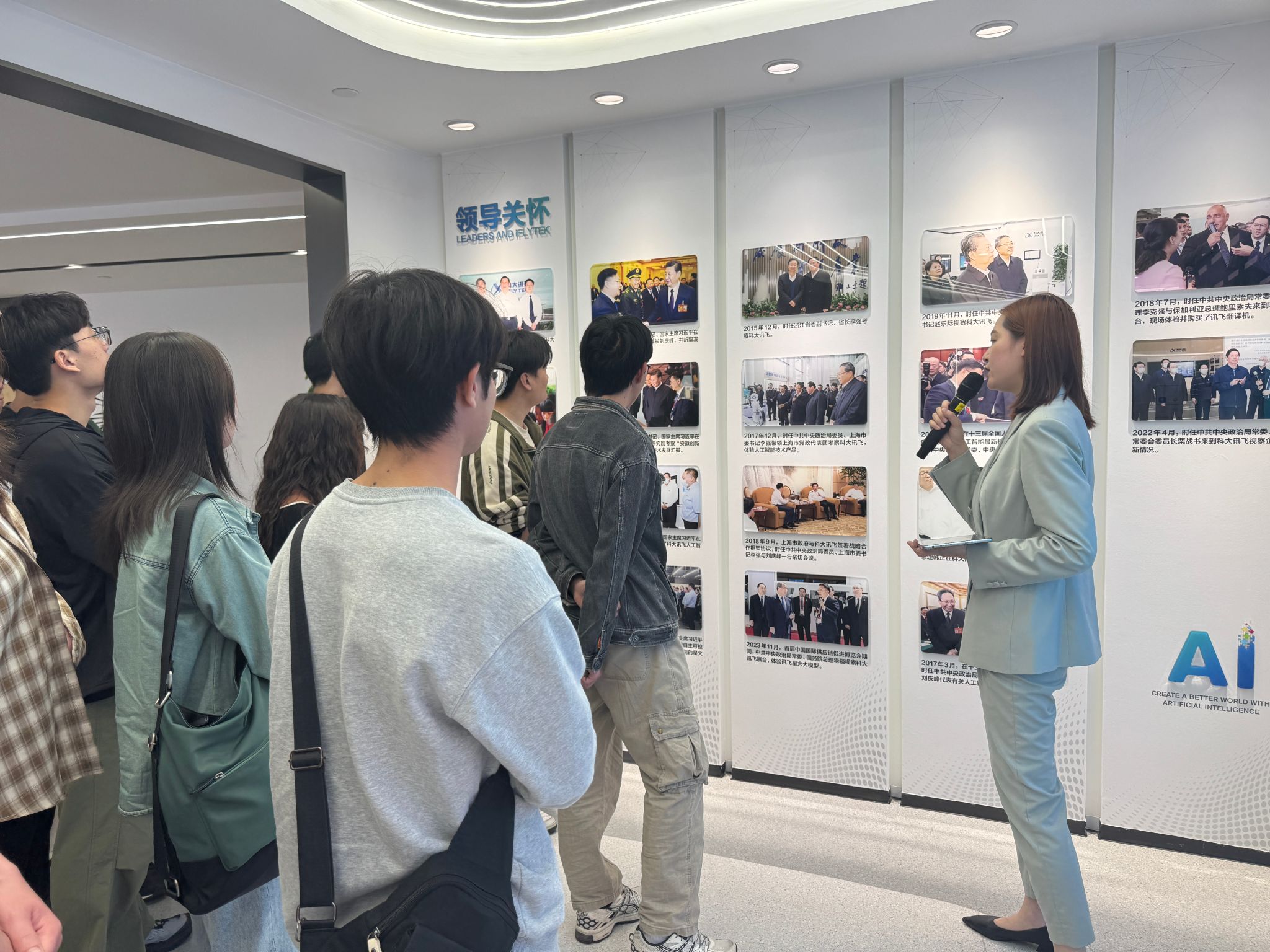 抵达科大讯飞后,同学们首先参观了企业展厅。展厅内,各类人工智能产品琳琅满目,涵盖了教育、医疗、工业、办公等多个领域。从能够精准进行语音识别与转换的办公软件,到助力个性化学习的智能教育设备,再到可辅助医生进行初步诊断的医疗 AI 系统,同学们亲身感受到了人工智能技术给生活和工作带来的巨大变革,不时发出阵阵惊叹。在工作人员细致的讲解下,大家对科大讯飞在人工智能领域的技术研发、创新成果及应用实践有了直观的认识。