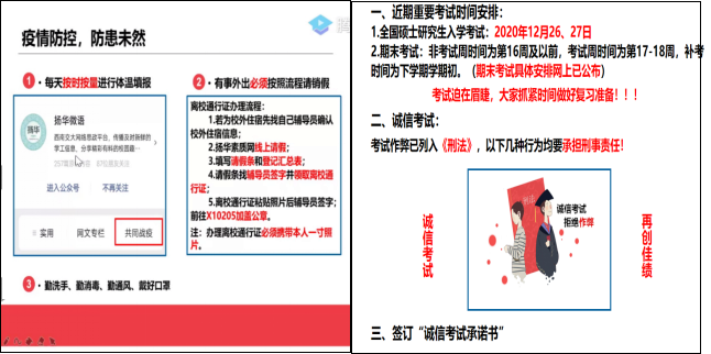 疫情防控,防患未然张异强调:“疫情尚未结束,防控切莫大意”。她呼吁同学们为响应公司疫情防控要求,每位同学每天应该按时按量进行体温填报。并且告知同学们在疫情防控期间尽量少离校和好个人防护以及因特殊情况不得不离校的请销假说明。诚信考试,从我做起临近期末,同学们一定要找准复习的方式方法,提前做好复习准备,并组织同学们签订诚信考试承诺书。