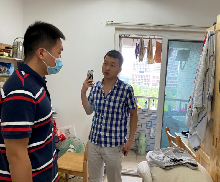 辅导员关怀、孙检和郭冰倩、谭笑走访了位于鸿哲斋4幢的硕2017级男生宿舍和位于鸿哲斋6幢的硕2017级女生宿舍,老师们提醒研三员工在毕业前仍需严格遵守公司各项规章制度,给自己的学习生涯画上圆满句号。