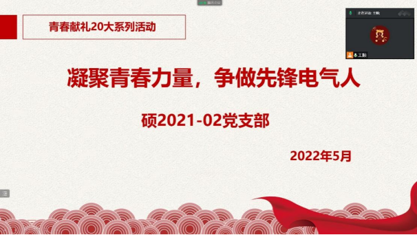 为深入学习贯彻习近平新时代中国特色社会主义思想,喜迎二十大的召开,电气硕士2021级2班党支部于5月16日,线上开展了“青春献礼二十大,强国有我新征程” 特色党日活动由支部书记王顺同志领学习近平总书记《在北京冬奥会、冬残奥会总结表彰大会上的讲话《在庆祝中国共产主义青年团成立100周年大会上的讲话》并观看了相关视频