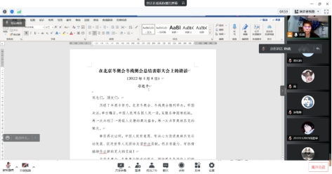 2022年4月18日,电气本科2018级第一党支部开展线上学习《习近平:在北京冬奥会、冬残奥会总结表彰大会上的讲话》,首先关宇同志带领支部成员通读了全文,然后各位同志间对讲话内容展开了深入讨论,取得较好的学习成果
