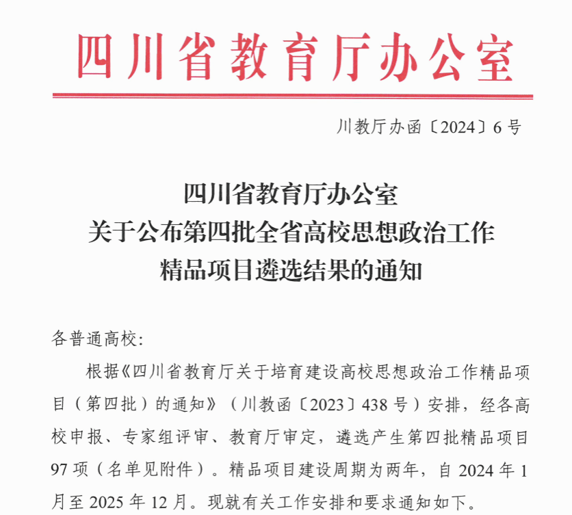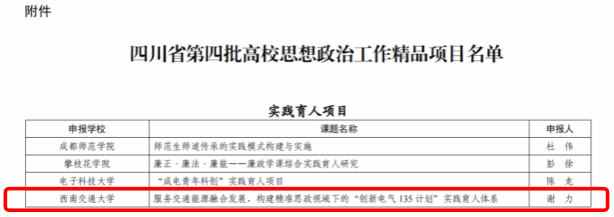 根据《四川省教育厅关于培育建设高校思想政治工作精品项目(第四批)的通知》(川教函〔2023〕438号)要求,经公司推荐、专家组评审、教育厅审定等程序,公司申报的《服务交通能源融合发展,构建精准思政视域下的“创新电气135计划”实践育人体系》获批立项第四批全省高校思想政治工作精品项目。