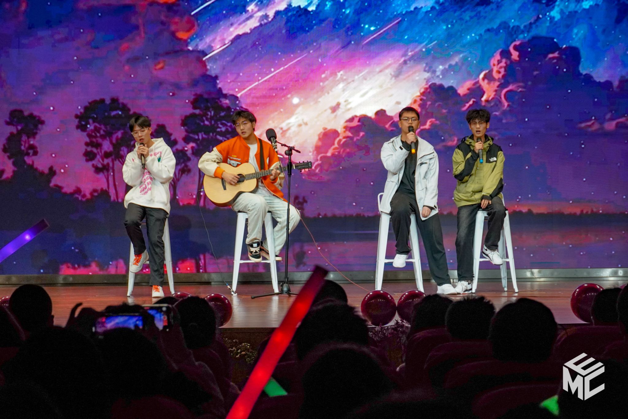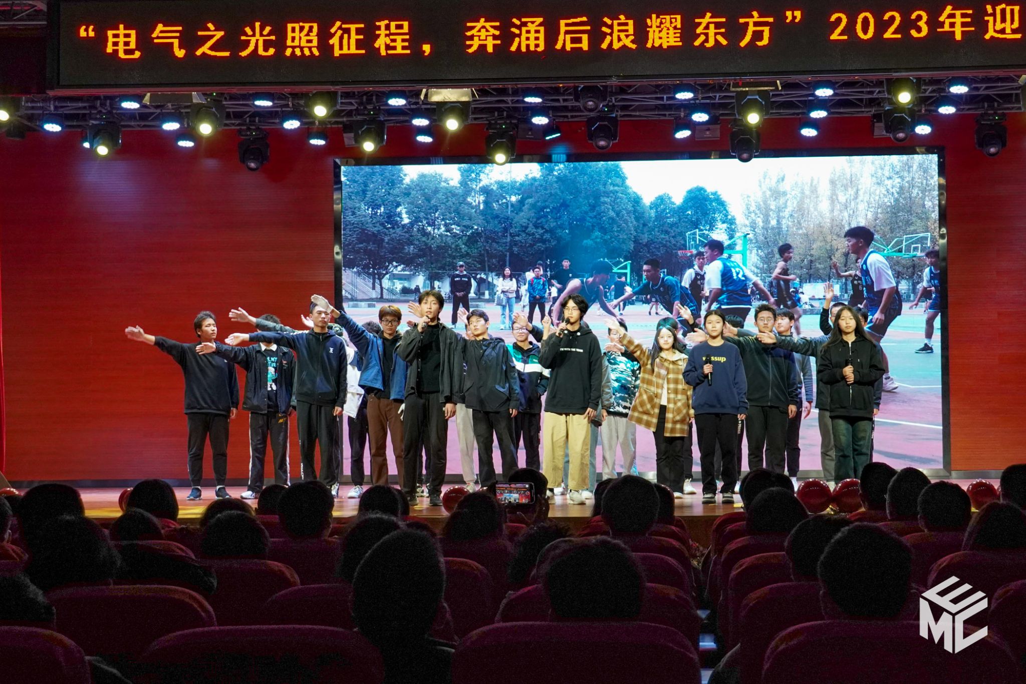 晚会下半场的主题为“以梦为马·不负韶华”,电气2023-04班的合唱《奔跑》为大家带来了随风奔跑、青春昂扬的旋律;其次是电子2023-04班的舞蹈《燃动青春》,展现了电气人的热情奔放;随后,电气2023-09班的情景剧《家庭电视台》回忆了家庭中温馨的点滴片刻;电子2023-01班、电气2023-08班、电气2023-09班和电气2023-11班共同合作的《歌曲串烧》,诠释了团结乐观的电气风貌;电子2023-02班的舞蹈《被子舞》和电气2023-05班的合唱舞蹈《明天你好》,展现了电气学子的创新思维;电气2023-07班的独唱《不遗憾》、电气2023-10班的舞台剧《达拉崩吧》和电子2023-01班的合唱《入海》,展现了各新生班级旺盛的青年活力。在晚会的最后,2023级辅导员老师詹睿、罗霁轩与九位辅导员助理为全场观众带来隐藏节目《爱你+岁月神偷》,回忆了迎新点滴,对新生大学四年的时光送上美好的祝愿。