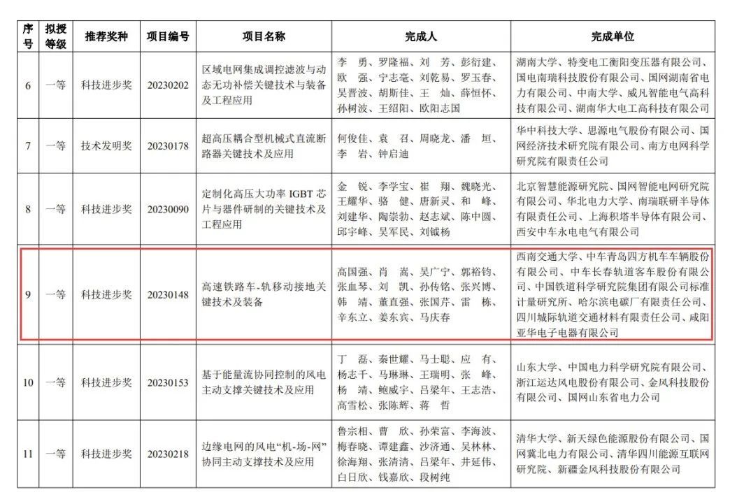 近日,2023年度中国电工技术学会科学技术奖授奖项目(人)名单正式揭晓。公司高国强教授主持的项目《高速铁路车-轨移动接地关键技术及装备》获得科技进步一等奖,胡海涛教授获青年科技奖。