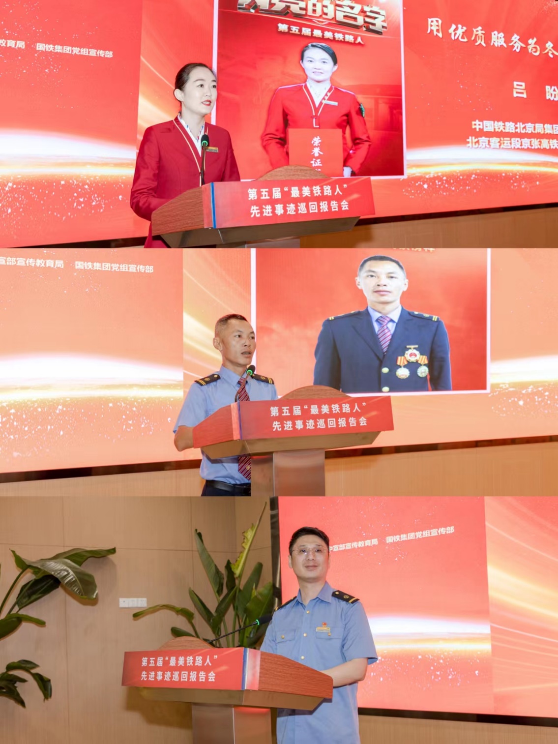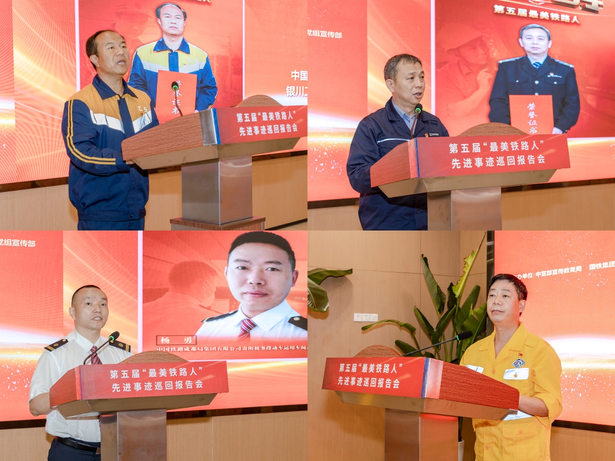 中国铁路兰州局集团有限公司银川工务段钢轨探伤车间探伤工黄涛,用质朴的话语,平静的口吻,讲述了他数十年如一日守护中国铁路,用匠心守护好钢轨安全,精益求精、守正创新的平凡小事。黄涛坚信,每一名铁路人,就是一支钢笔,只要认真负责,埋头苦干,勇于前行,就一定能交出一份不平凡的人生答卷。中国铁路成都局集团有限公司贵阳机务段动车运用车间贵广车队党支部书记张军以“向英雄司机致敬”为题,讲述了自己的同事,英雄司机杨勇的光荣事迹。张军表示,英雄虽然离去,但英雄精神历久弥新,对英雄的敬意,要体现在日常工作中,忠于职守,服务人民,要把英雄的崇高精神镌刻在心里,运用在学习实践中。