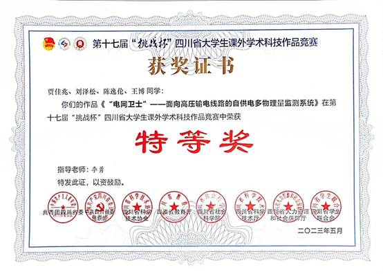 2023年5月16日,第十七届“挑战杯”四川省老员工课外学术科技作品竞赛终审决赛在成都大学圆满闭幕。beats365亚洲版官网李勇副教授指导2020级本科生贾佳兆、刘泽松、陈逸伦、王博完成作品“电网卫士——面向高压输电线路的自供电多物理量检测系统”,在1035件省赛优秀作品中脱颖而出,斩获特等奖,该奖项全省仅52项。